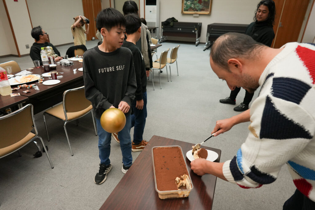 少し体を動かした後は、お待ちかねのデザートタイム。イタリアでは定番のティラミスを用意しました。マッシがサーブし、「もっと大盛り!」「たくさん食べたい!」といった子どもたちからの要望にも応えながら、楽しくいただきました。