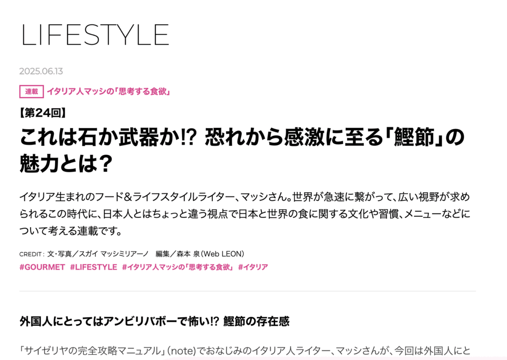 今回のLEONの記事は、「鰹節」について。 外国人が理解できないけどテンションが上がって、日本の食文化の深さに感銘を受ける世界一硬い食べ物の鰹節は、本当に魚なの?食べ物?と毎回驚きます。 外国人目線で新発見できる記事を書いたので、ぜひご覧くだ... -