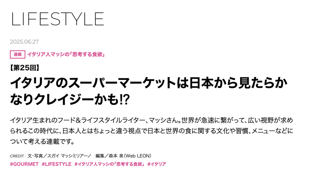 今回のLEONの記事は、イタリアのスーパーについて。 イタリアのスーパーでは笑ったりムカついたり、とにかく感情が大忙しなんです。マンマたちの大舞台と言っても過言ではありません。 日本では考えられない買い物の仕組みばかりで、これぞイタリア!と感... -