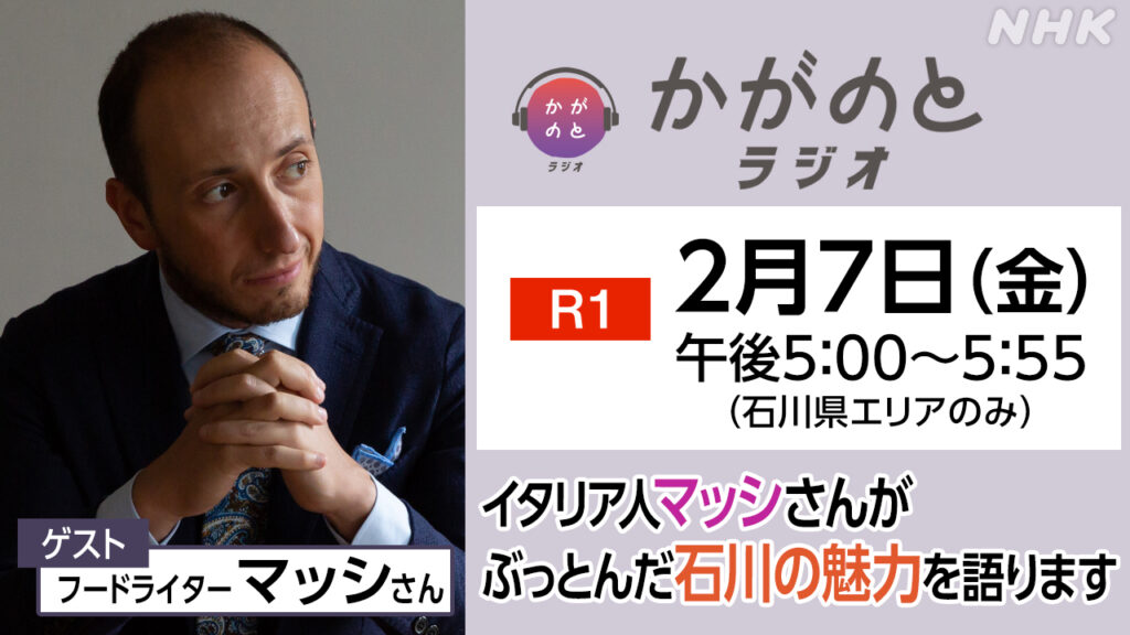 NHKの「かがのとラジオ」に出演しました。 金沢や食文化、日本の驚きについて楽しく話しました。 -